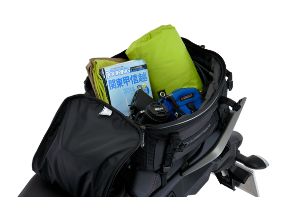 一見普通のシートバッグですが、最大の特徴は別売りのタンクバッグ「モジューロタンク」を最大3個まで連結できる拡張性!