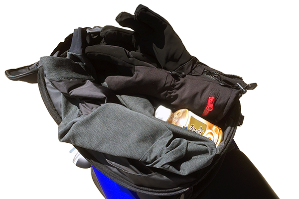 通常時の収納はミドルインナーと冬用グローブを入れて余力を残しますので、寒かったり暑かったりするこの時期は特に重宝するでしょう。