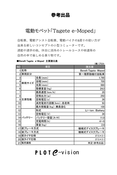 2. 電動モペット「Tagete e-Moped」 自転車、電動アシスト自転車、電動バイクの3通りの使い方が出来る新しいコンセプトの小型コミューター。通勤や通学の他、休日に郊外のトレールコース等のオールラウンドで楽しめます。