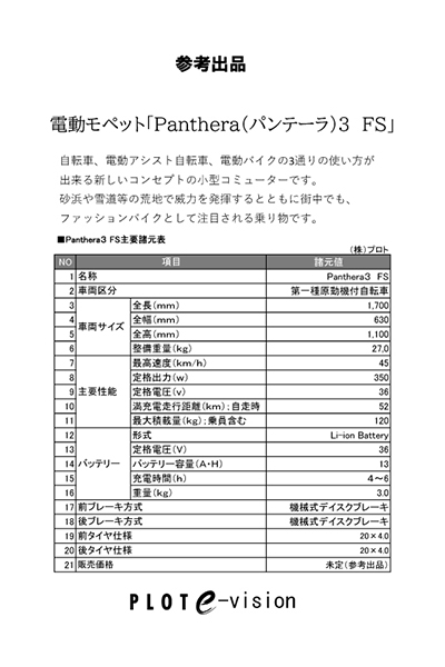 3. 電動モペット「Panthera(パンテーラ)3 FS」「Panthera(パンテーラ)3 RS」自転車、電動アシスト自転車、電動バイクの3通りの使い方が出来る新しいコンセプトの小型コミューター。砂浜や雪道等の荒地で威力を発揮するとともに街中でも、ファンバイクとして注目される乗り物です。