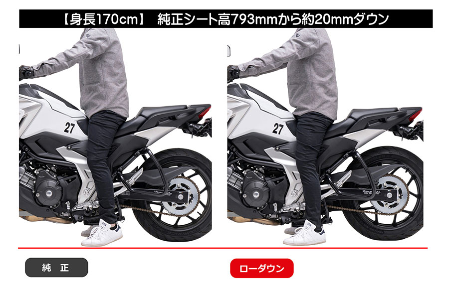 操安性の変化を考慮し、足つき性と運動性能のバランスが取れるローダウン量「20mm」に設定しています。