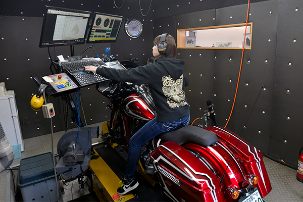 排出ガス試験(WMTC モード)は、CO、THC、NOX、CO2 等を測定し、全ての排出量に対し基準値以下でないと不合格となる。CO・THC を減らせばNOX が増え、NOX を減らせば CO・THC が増える。インジェクションチューニングで定評のあるショップでも、自動車排出ガス試験(WMTC モード)に挑戦したショップは数多くない。CO、THC、NOX、CO2 の測定は気温や湿度、気圧なども関係し、試験前におこなうテスト走行で合格数値を出しても安定しない以上、納得のいくまでテストはおこなわれた。この排出ガス試験で一番苦労したのは、エンジン温度・室温25℃からスタートするコールドスタートだった。S&S製大排気量エンジンの多くは、イージースタートカムシャフトを搭載している。イージースタートカムシャフトとは、オートコンプレッションリリースの様な機構をカムに設け、エンジン始動時に燃焼室内に堆積している未燃ガスを触媒の効いていないマフラー側に抜いてしまうことだった。さまざまな高いハードルもあり、通常業務とは別に、毎晩遅くまで計測・調整を繰り返し約 6 ヶ月の日々を費やし、日本車両検査協会より自動車排出ガス試験結果・加速走行騒音試験結果の合格通知を受け取った。