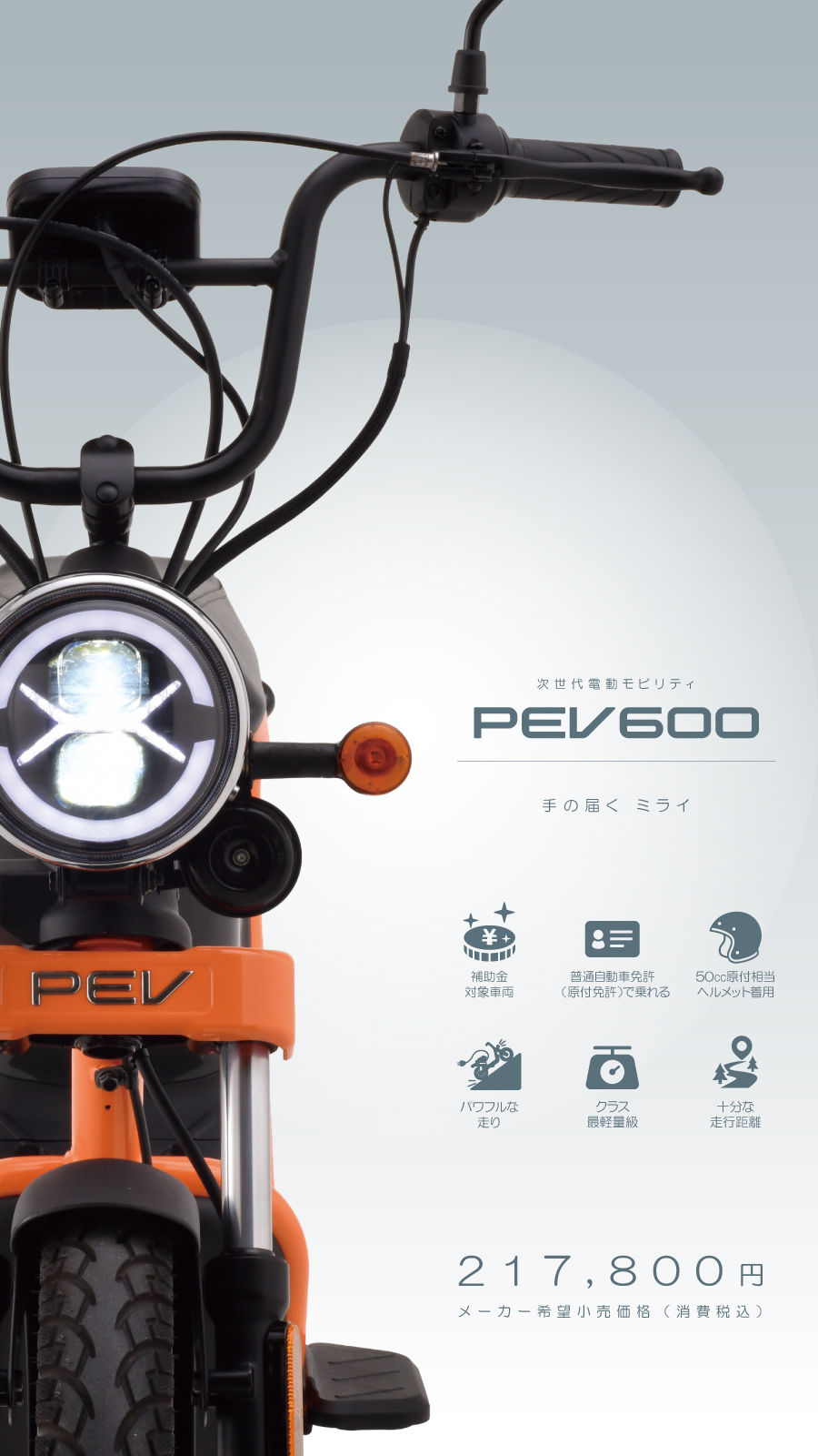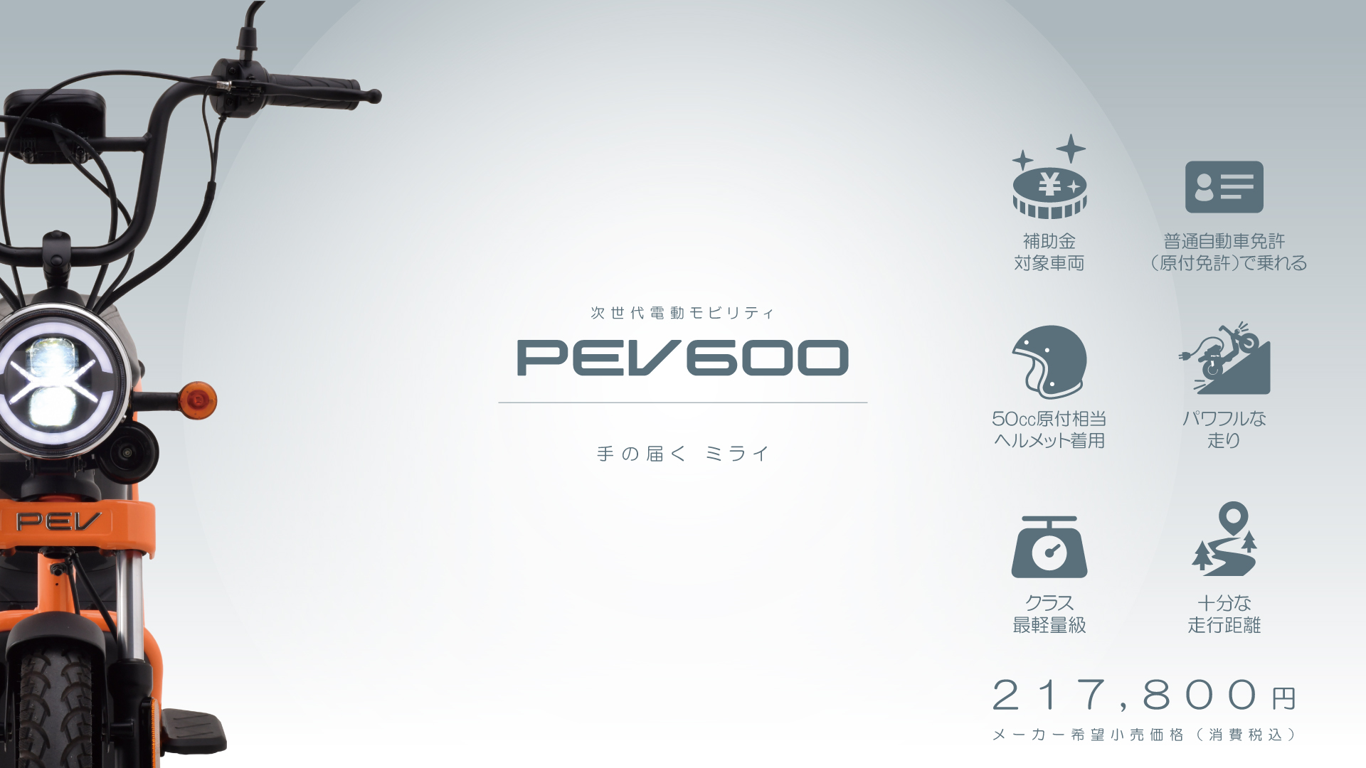 PEV600は、電動車の普及を促進する購入支援補助金の対象車です。 補助金には、国が運営する補助金制度の他、地方自治体によっては、独自の補助金制度を用意している場合もあります。